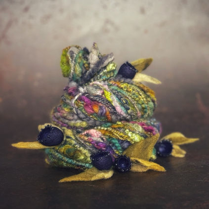 Fileuse de laine d’art depuis vingt ans, elle façonne des fils texturés, bruts ou nuancés, à partir de matières naturelles. Sa pratique est intuitive, presque méditative. À ce geste lent est venue s’ajouter, plus récemment, la flamme : l’émaillage sur cuivre recyclé. Là encore, les textures, les craquelures, les transparences deviennent langage.